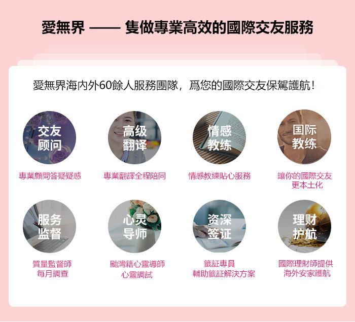 愛無界將多年的行業豐富經驗與培訓課程相融合,形成愛無界獨有的國際交友諮詢體繫,該諮詢體繫在國際交友的專業指導作用獲得了在線會員的一緻認可!